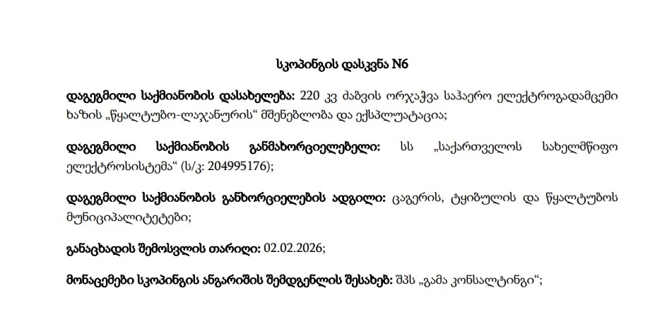 „ცაგერის, ტყიბულის და წყალტუბოს მუნიციპალიტეტებში სს „საქართველოს სახელმწიფო ელექტროსისტემის“ 220 კვ ძაბვის ორჯაჭვა საჰაერო ელექტროგადამცემი ხაზის „წყალტუბოლაჯანურის“ მშენებლობასა და ექსპლუატაციაზე სკოპინგის დასკვნის გაცემის შესახებ“